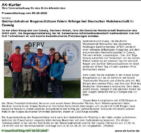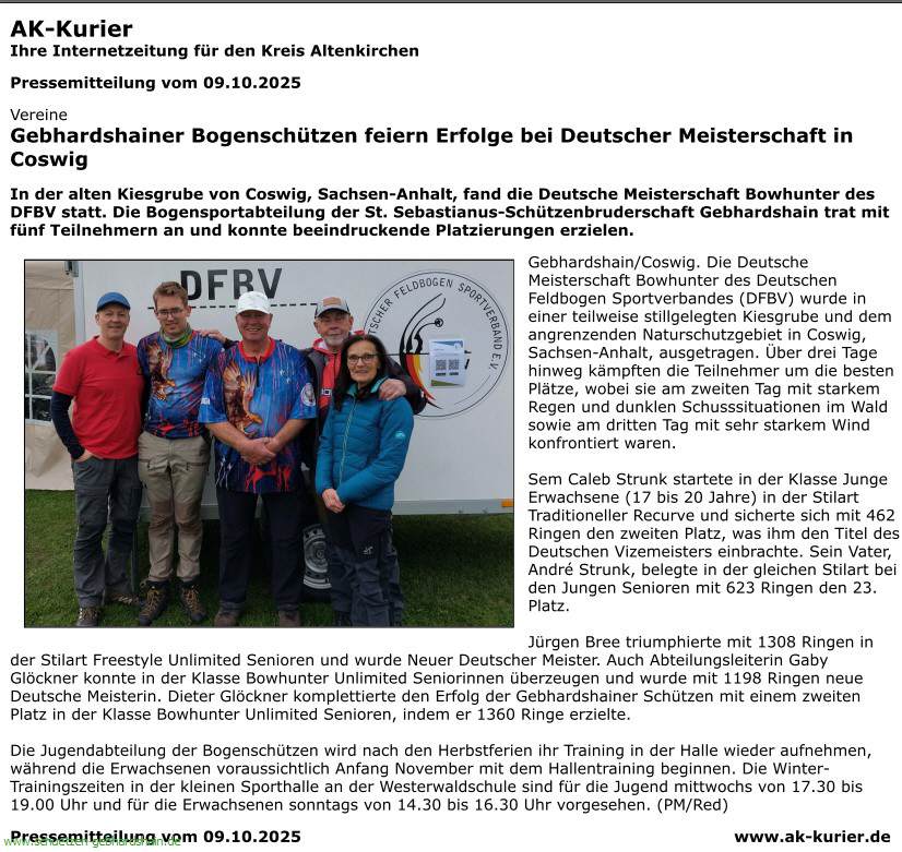 Im Namen der Sankt Sebastianus Schützenbruderschaft Gebhardshain, grüße ich alle Sportschützen und die uns angeschlossenen Mitglieder der Bogenabteilung. In Zeiten, in denen ein generelles Verbieten von Schusswaffen und auch Bogenwaffen, mit nicht nachlassenden ideologisch begründeten Vorbehalten - man kann sagen, fast schon gebetsmühlenartig - wiederholt werden, heißt es Flagge zu zeigen und zu seinem Hobby zu stehen.